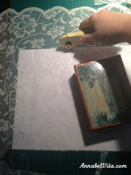 Ensuite, elle coupe la dentelle, qu’elle avait acheté à IKEA, en utilisant un modèle de sa vitre.