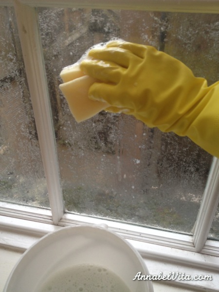 Tout d’abord, Annabel peint ses fenêtres avec une pâte autodurcissante de fécule de maïs. Pour faire la pâte, vous devez mélanger de fécule de maïs (deux cuillères) avec de l’eau froide (deux cuillères). Puis ajoutez, peu à peu, de l’eau bouillante (une tasse et demi). La quantité dont vous en avez besoin dépend de la taille de votre fenêtre.